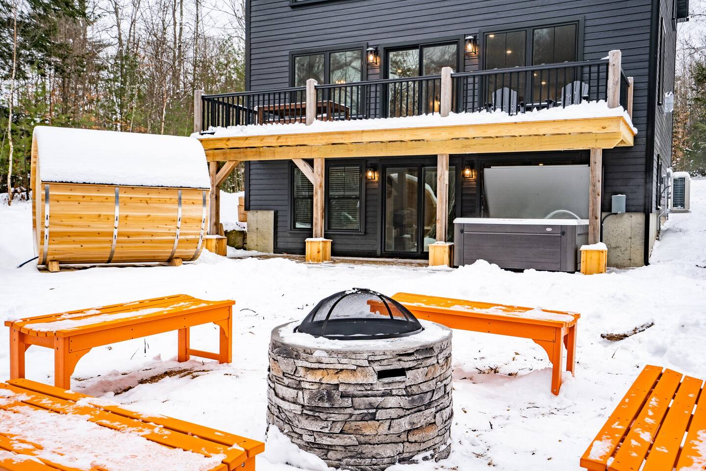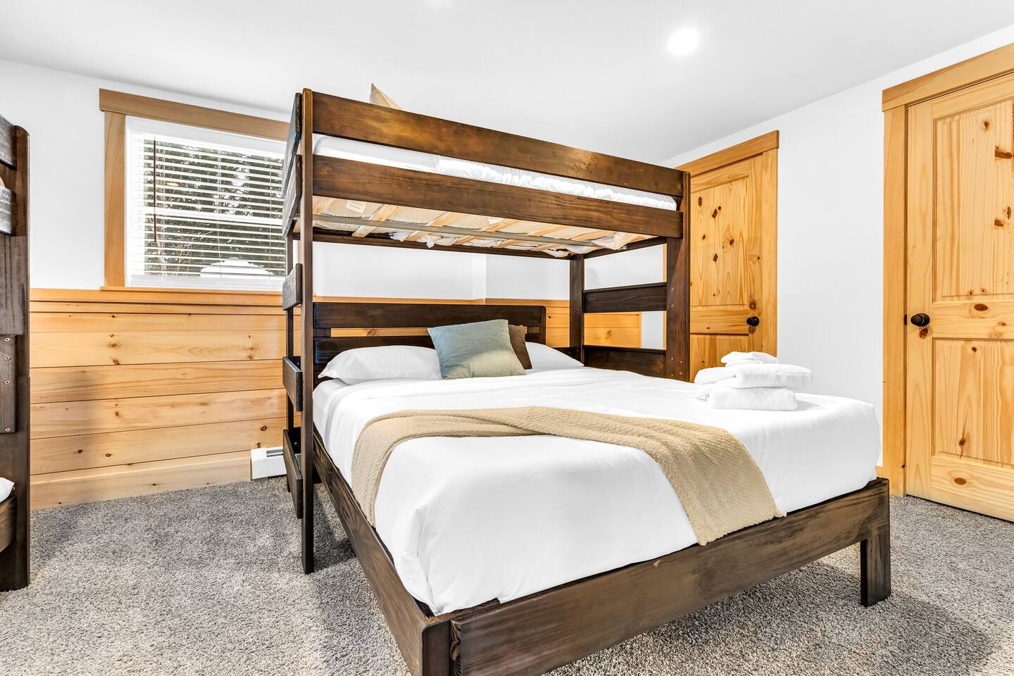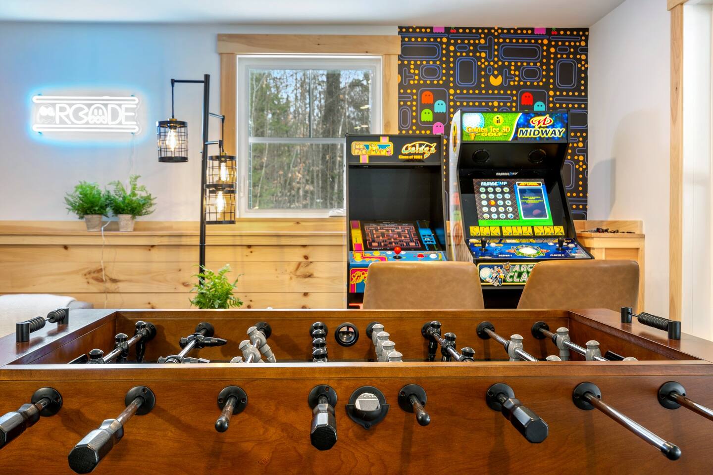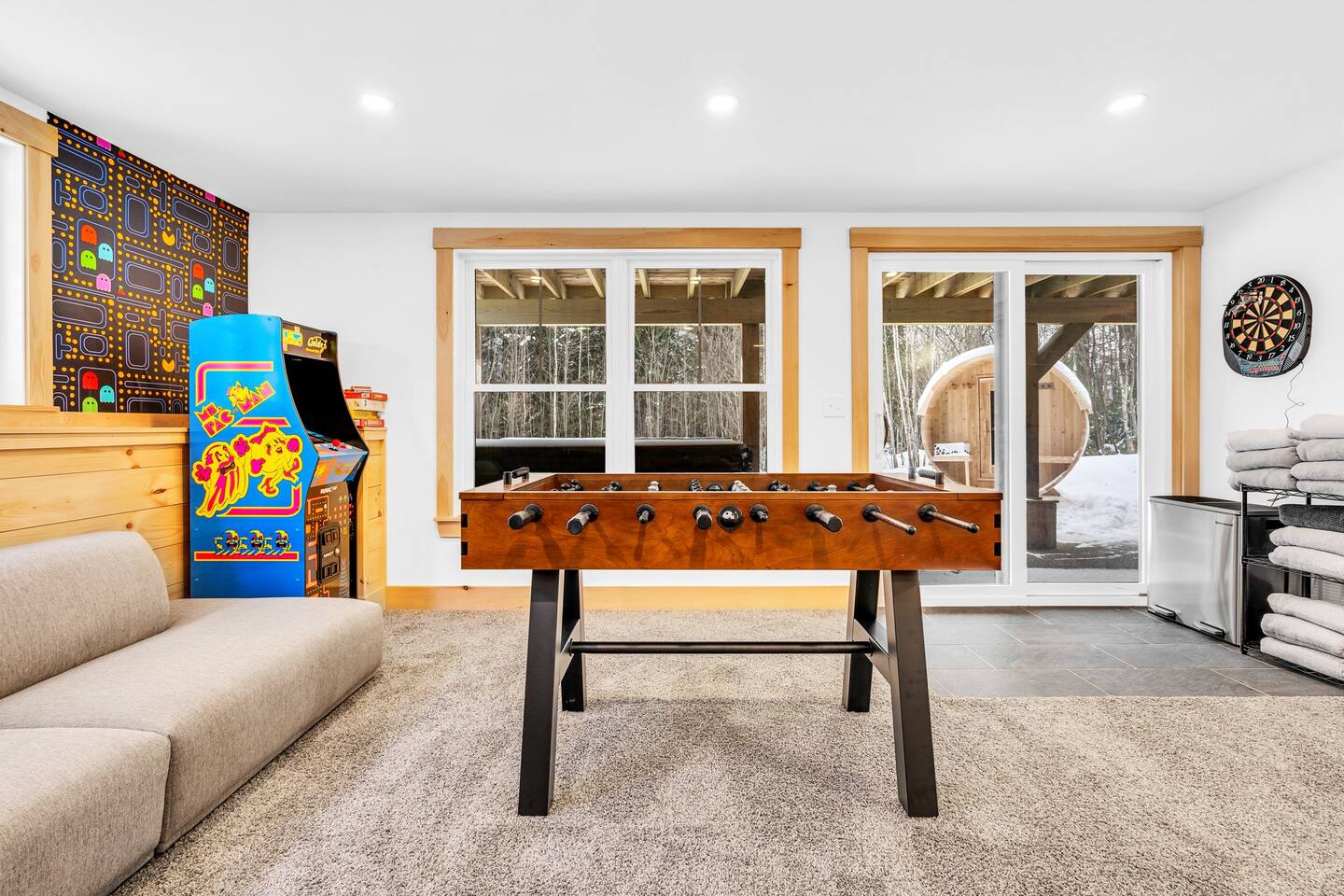 KEY FEATURES: ☀ 6 person hot tub ☀ Barrel Sauna ☀ Fire Pit ☀ Game Room- Arcade game, board games, foosball ☀ Modern kitchen with stainless steel appliances ☀ Air Conditioning 4 Bedrooms: 8 beds; 1 King, 1 Queen, 1 Full over Queen, 1 Twin over Queen, 1 Twin over Twin Here Are A Few Kind Words From Our Past Guests: "We had an incredible stay at this chalet! The bedrooms were beautifully decorated, and the bathrooms, especially the master en suite, felt luxurious. The backyard stole the show with a barrel sauna and hot tub!!!! Highly recommended!" - Becca ☆☆ BEDROOMS ☆☆ The master bedroom features a luxurious king-sized bed and TV, while the queen bedroom exudes comfort in every way. The 2 bunk rooms allow for versatile sleeping arrangements one room including a full over queen bunk and the other room a twin over queen and twin over twin bunks and ensure a cozy and enjoyable stay for families or groups. ☆☆ BATHROOMS ☆☆ Pamper yourself in the well-appointed bathrooms of this chalet. The master bedroom boasts a full en suite bathroom featuring a stunning floor-to-ceiling tiled shower, offering a spa-like experience. Another full bathroom with an elegant tiled shower ensures convenience, complemented by a half bath for additional comfort. The basement level, housing the vibrant game area, includes a bathroom with a convenient tub-shower combo, providing flexibility and ensuring a delightful stay for all guests. ☆☆ KITCHEN, DINING, GREAT ROOM ☆☆ Experience seamless flow and modern comforts in the design of the kitchen, dining room, and living room in this chalet. The living room, adorned with tasteful decor, welcomes you with a cozy ambiance featuring a large smart TV and a comforting gas fireplace, creating a perfect setting for relaxation. The dining room boasts a spacious table, inviting the whole family to gather for delightful meals. The modern kitchen, equipped with state-of-the-art stainless steel appliances, adds both style and functionality to your culinary adventures, making this central living space a hub of warmth and contemporary charm. ☆☆ GAME ROOM ☆☆ The downstairs game room is a haven for entertainment, featuring foosball, board games, and an arcade game for endless fun. With a comfortable seating area and a Smart TV, it's the perfect space to unwind, and its direct access to the backyard transforms the area into an oasis of relaxation, seamlessly blending indoor and outdoor enjoyment. ☆☆ OUTSIDE SPACE ☆☆ Step into a backyard paradise that steals the show with its captivating features! The highlight is a brand new and popular barrel sauna, providing a unique and indulgent experience. The luxury 6-person hot tub adds a touch of opulence, and a dedicated firepit with inviting bench seating completes the ensemble, creating a perfect outdoor haven for relaxation and socializing. ★☆ Book Today & Let Us Take Care Of You! ☆★